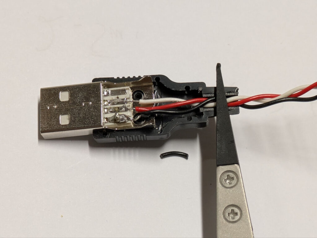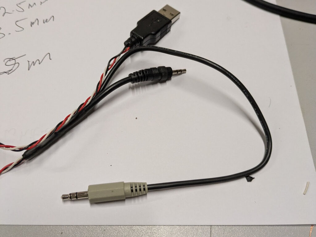 The male USB connector was an easy find, and so was the 3.5 mm jack, but I had to dig deep in the “jack pile” to find a 2.5 mm jack. In the end, I cut up what looked like a custom cable from an old digital camera. A little soldering and heat-shrink later, I had a working cable.