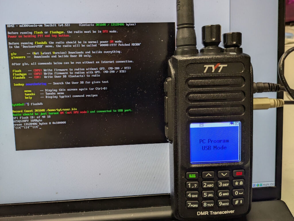 With VirtualBox installed on my Ubuntu laptop, flashing the radio was straightforward. More importantly, it proved my soldering worked, and I now had a much more ham-friendly handheld.